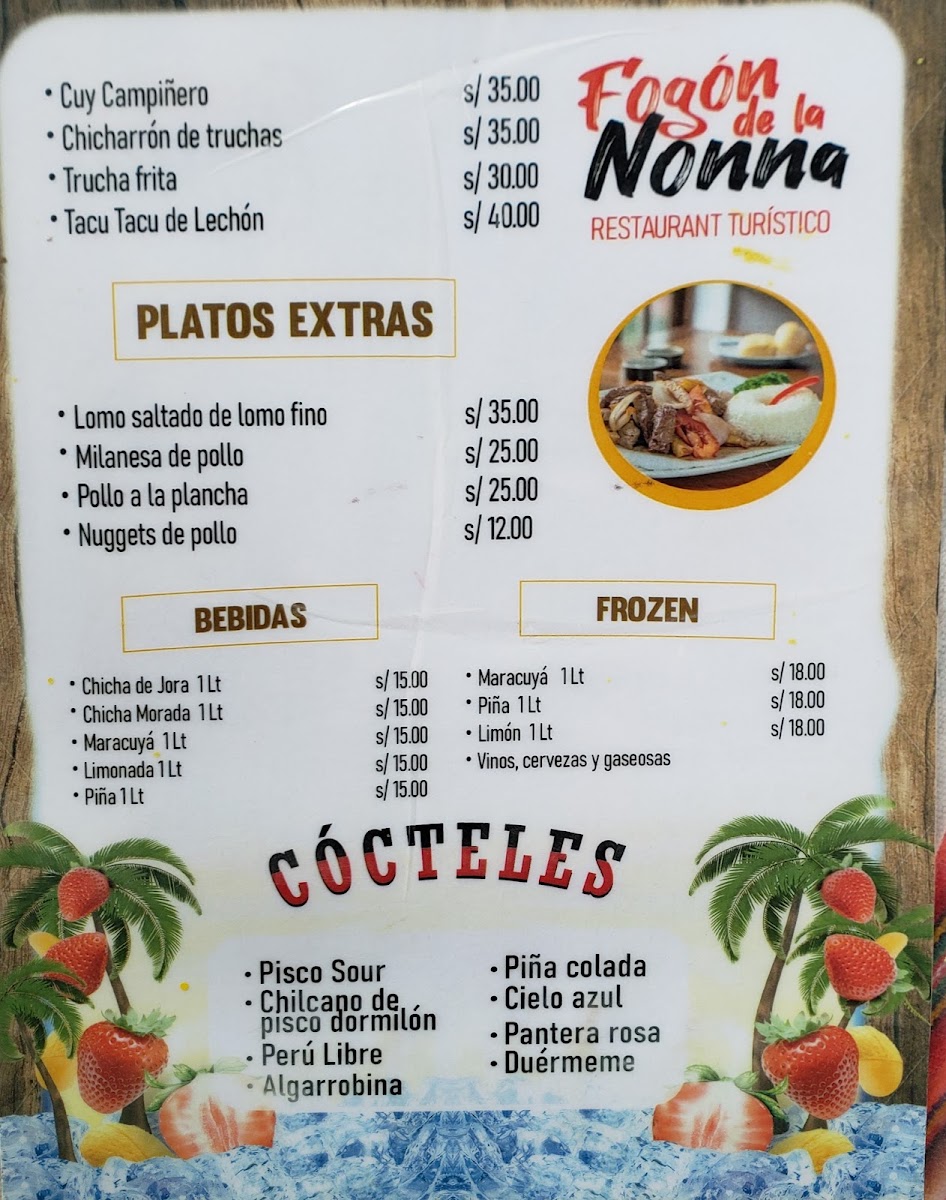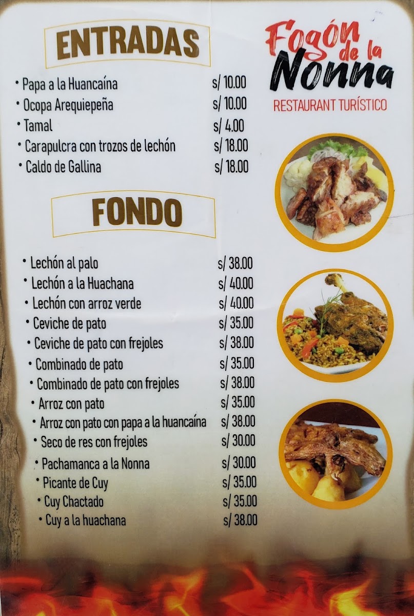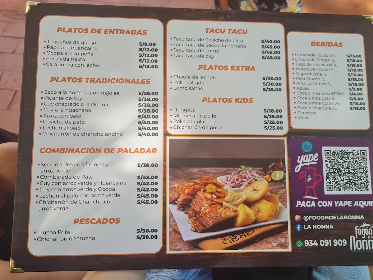 El Fogon De La Nonna offers a diverse menu that beautifully highlights the flavors of traditional Peruvian cuisine with a unique twist. One of the standout dishes is the Ceviche de Pato Con Frejoles, a delightful combination of tender duck and vibrant ceviche, perfectly complemented by a side of hearty beans. For those craving something crispy and savory, the Chicharrón Con Papas provides a satisfying crunch with juicy, well-seasoned pork paired with crispy fries. Another signature dish is the Arroz Con Pato Con Papa A la Huancaina, which brings together flavorful rice and succulent duck, topped with a rich, creamy Huancaina sauce and served with golden potatoes. Each dish offers a comforting and rich experience, reflecting the culinary traditions of Huacho while adding a distinctive touch that sets El Fogon De La Nonna apart from other local eateries. The menu's offerings are hearty, packed with bold flavors, and sure to satisfy anyone in search of an authentic taste of Peru.